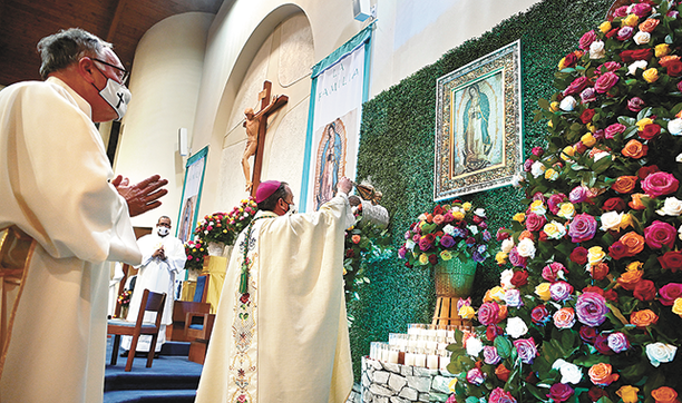 At St. Peter the Apostle Parish here, a cascade of colorful roses surrounded the image of Our Lady of Guadalupe for the feast day’s English/Spanish vigil Mass on the evening of Dec. 11. Bishop Kevin Sweeney was the main celebrant of the Mass, which was livestreamed through St. Peter the Apostle Parish’s website and its Facebook page.